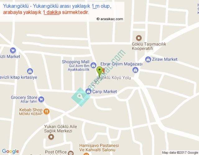 Yukarıgöklü - Yukarıgöklü arası yaklaşık olarak 90 km/h ile yukarıda belirtilen sürede olup, iki yerin kuş uçuşu uzaklığı (mesafesi) 0'dir. Yolculuk otobüsle 1 dakika sürmektedir.