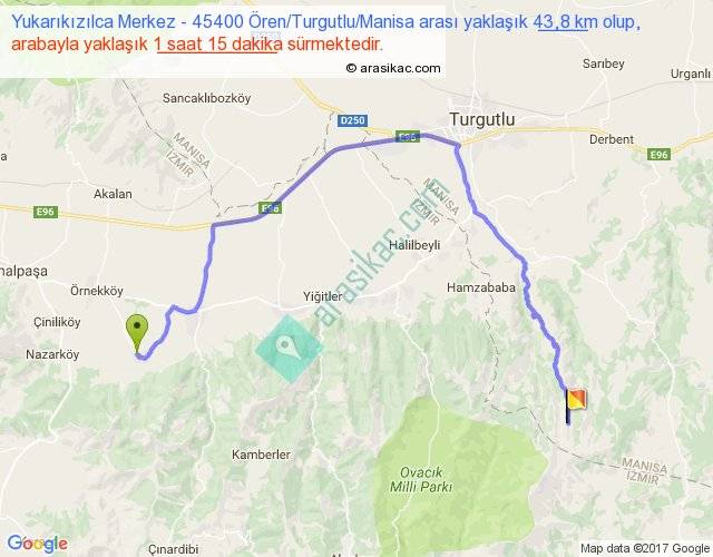 Yukarıkızılca Merkez - 45400 Ören Turgutlu Manisa arası yaklaşık olarak 90 km/h ile yukarıda belirtilen sürede olup, iki yerin kuş uçuşu uzaklığı (mesafesi) 23'dir. Yolculuk otobüsle 1 saat 37 dakika sürmektedir.