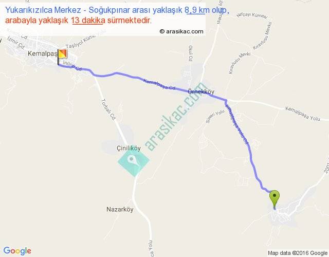 Yukarıkızılca Merkez - Soğukpınar arası yaklaşık olarak 90 km/h ile yukarıda belirtilen sürede olup, iki yerin kuş uçuşu uzaklığı (mesafesi) 8'dir. Yolculuk otobüsle 16 dakika sürmektedir.