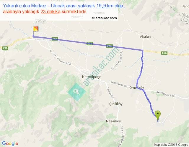 Yukarıkızılca Merkez - Ulucak arası yaklaşık olarak 90 km/h ile yukarıda belirtilen sürede olup, iki yerin kuş uçuşu uzaklığı (mesafesi) 15'dir. Yolculuk otobüsle 29 dakika sürmektedir.