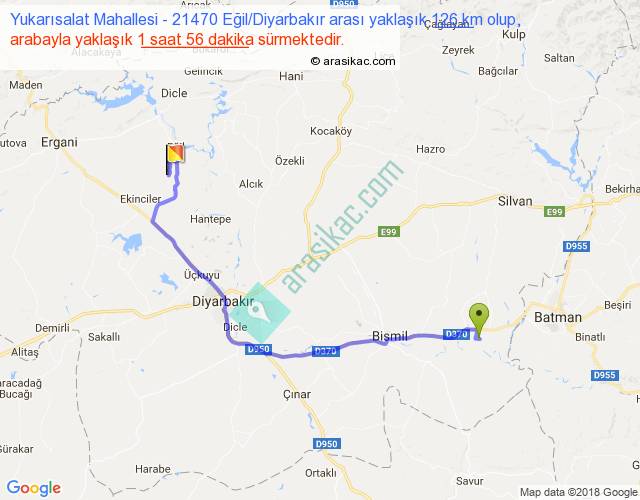 Yukarısalat Mahallesi - 21470 Eğil Diyarbakır arası yaklaşık olarak 90 km/h ile yukarıda belirtilen sürede olup, iki yerin kuş uçuşu uzaklığı (mesafesi) 84'dir. Yolculuk otobüsle 2 saat 30 dakika sürmektedir.