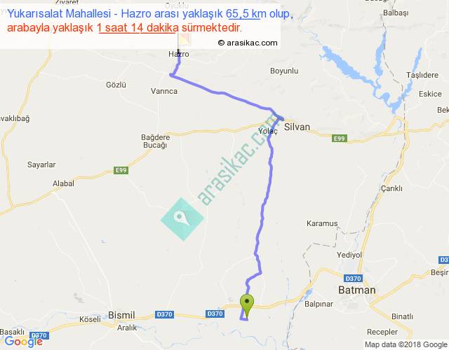Yukarısalat Mahallesi - Hazro arası yaklaşık olarak 90 km/h ile yukarıda belirtilen sürede olup, iki yerin kuş uçuşu uzaklığı (mesafesi) 47'dir. Yolculuk otobüsle 1 saat 36 dakika sürmektedir.