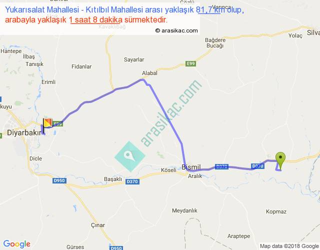 Yukarısalat Mahallesi - Kıtılbıl Mahallesi arası yaklaşık olarak 90 km/h ile yukarıda belirtilen sürede olup, iki yerin kuş uçuşu uzaklığı (mesafesi) 57'dir. Yolculuk otobüsle 1 saat 28 dakika sürmektedir.