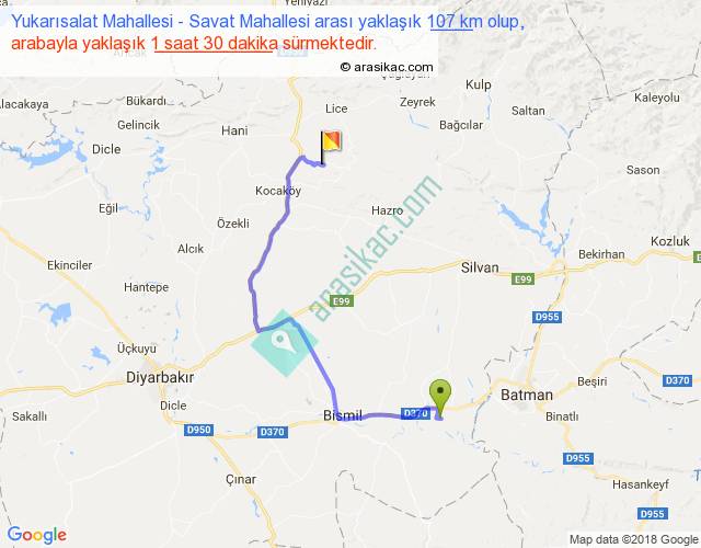 Yukarısalat Mahallesi - Savat Mahallesi arası yaklaşık olarak 90 km/h ile yukarıda belirtilen sürede olup, iki yerin kuş uçuşu uzaklığı (mesafesi) 61'dir. Yolculuk otobüsle 1 saat 57 dakika sürmektedir.
