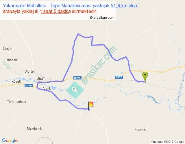 Yukarısalat Mahallesi - Tepe Mahallesi arası yaklaşık olarak 90 km/h ile yukarıda belirtilen sürede olup, iki yerin kuş uçuşu uzaklığı (mesafesi) 13'dir. Yolculuk otobüsle 1 saat 24 dakika sürmektedir.