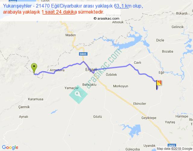 Yukarışeyhler - 21470 Eğil Diyarbakır arası yaklaşık olarak 90 km/h ile yukarıda belirtilen sürede olup, iki yerin kuş uçuşu uzaklığı (mesafesi) 49'dir. Yolculuk otobüsle 1 saat 49 dakika sürmektedir.