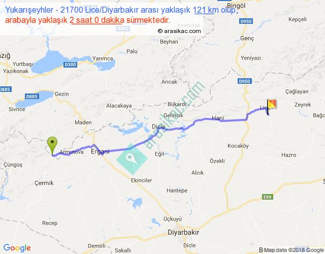 Yukarışeyhler - 21700 Lice Diyarbakır arası yaklaşık olarak 90 km/h ile yukarıda belirtilen sürede olup, iki yerin kuş uçuşu uzaklığı (mesafesi) 103'dir. Yolculuk otobüsle 2 saat 36 dakika sürmektedir.