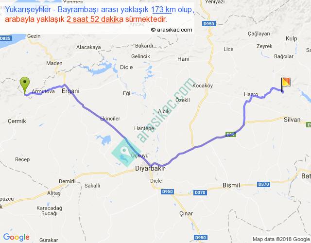 Yukarışeyhler - Bayrambaşı arası yaklaşık olarak 90 km/h ile yukarıda belirtilen sürede olup, iki yerin kuş uçuşu uzaklığı (mesafesi) 126'dir. Yolculuk otobüsle 3 saat 43 dakika sürmektedir.