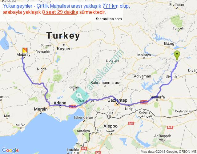 Yukarışeyhler - Çiftlik Mahallesi arası yaklaşık olarak 90 km/h ile yukarıda belirtilen sürede olup, iki yerin kuş uçuşu uzaklığı (mesafesi) 478'dir. Eğer belirtilen yerler arasında uçak seferi var ise bu süre uçakla 44 dakika'ya kadar düşebilir. Yolculuk otobüsle 11 saat 1 dakika sürmektedir.