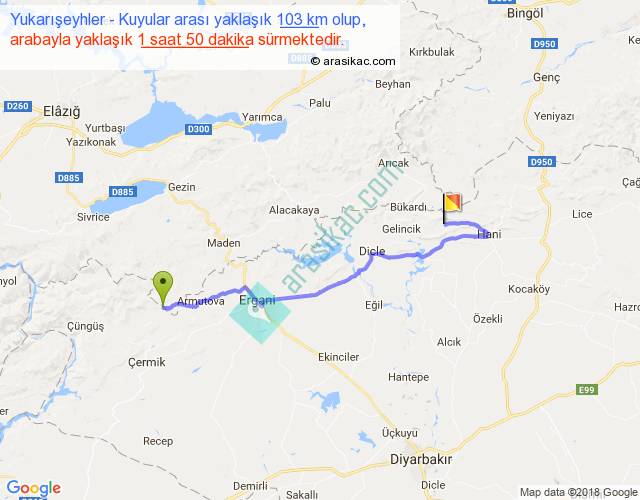 Yukarışeyhler - Kuyular arası yaklaşık olarak 90 km/h ile yukarıda belirtilen sürede olup, iki yerin kuş uçuşu uzaklığı (mesafesi) 70'dir. Yolculuk otobüsle 2 saat 23 dakika sürmektedir.