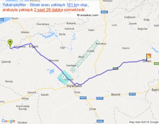 Yukarışeyhler - Silvan arası yaklaşık olarak 90 km/h ile yukarıda belirtilen sürede olup, iki yerin kuş uçuşu uzaklığı (mesafesi) 132'dir. Yolculuk otobüsle 3 saat 12 dakika sürmektedir.