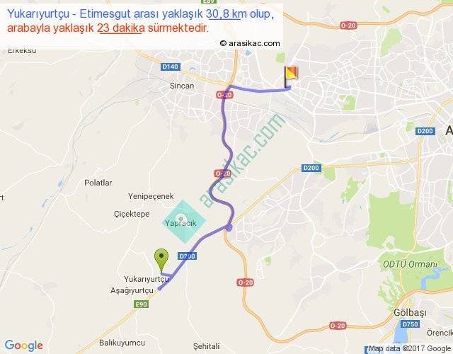 Yukarıyurtçu - Etimesgut arası yaklaşık olarak 90 km/h ile yukarıda belirtilen sürede olup, iki yerin kuş uçuşu uzaklığı (mesafesi) 18'dir. Yolculuk otobüsle 29 dakika sürmektedir.