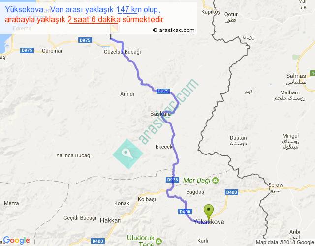 Yüksekova - Van arası yaklaşık olarak 90 km/h ile yukarıda belirtilen sürede olup, iki yerin kuş uçuşu uzaklığı (mesafesi) 101'dir. Yolculuk otobüsle 2 saat 39 dakika sürmektedir.