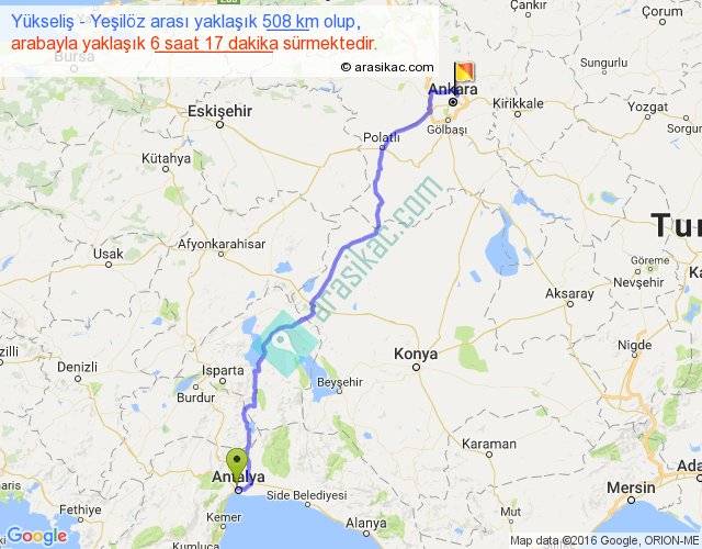 Yükseliş - Yeşilöz arası yaklaşık olarak 90 km/h ile yukarıda belirtilen sürede olup, iki yerin kuş uçuşu uzaklığı (mesafesi) 390'dir. Eğer belirtilen yerler arasında uçak seferi var ise bu süre uçakla 36 dakika'ya kadar düşebilir. Yolculuk otobüsle 8 saat 10 dakika sürmektedir.