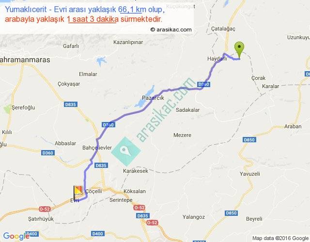 Yumaklıcerit - Evri arası yaklaşık olarak 90 km/h ile yukarıda belirtilen sürede olup, iki yerin kuş uçuşu uzaklığı (mesafesi) 54'dir. Yolculuk otobüsle 1 saat 21 dakika sürmektedir.