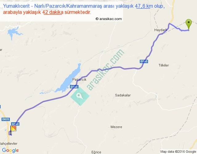 Yumaklıcerit - Narlı Pazarcık Kahramanmaraş arası yaklaşık olarak 90 km/h ile yukarıda belirtilen sürede olup, iki yerin kuş uçuşu uzaklığı (mesafesi) 40'dir. Yolculuk otobüsle 54 dakika sürmektedir.