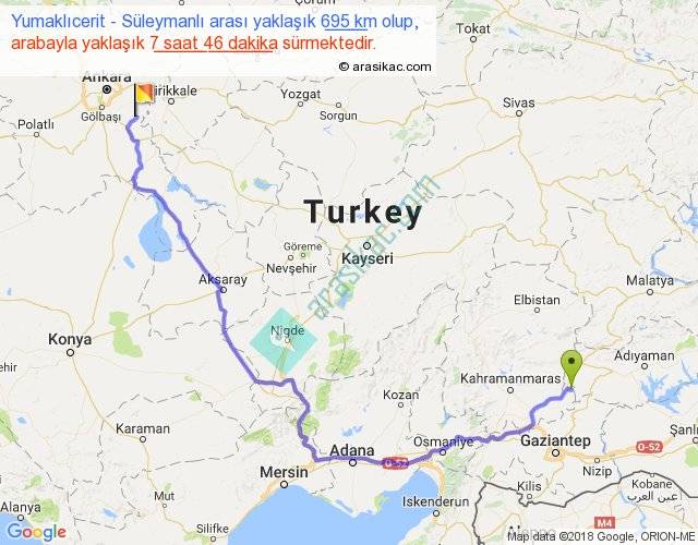 Yumaklıcerit - Süleymanlı arası yaklaşık olarak 90 km/h ile yukarıda belirtilen sürede olup, iki yerin kuş uçuşu uzaklığı (mesafesi) 446'dir. Eğer belirtilen yerler arasında uçak seferi var ise bu süre uçakla 41 dakika'ya kadar düşebilir. Yolculuk otobüsle 10 saat 5 dakika sürmektedir.
