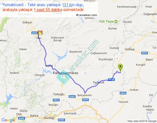 Yumaklıcerit - Tekir arası yaklaşık olarak 90 km/h ile yukarıda belirtilen sürede olup, iki yerin kuş uçuşu uzaklığı (mesafesi) 87'dir. Yolculuk otobüsle 2 saat 29 dakika sürmektedir.