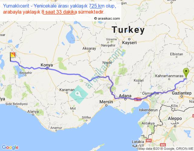 Yumaklıcerit - Yenicekale arası yaklaşık olarak 90 km/h ile yukarıda belirtilen sürede olup, iki yerin kuş uçuşu uzaklığı (mesafesi) 558'dir. Eğer belirtilen yerler arasında uçak seferi var ise bu süre uçakla 51 dakika'ya kadar düşebilir. Yolculuk otobüsle 11 saat 6 dakika sürmektedir.