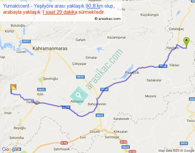 Yumaklıcerit - Yeşilyöre arası yaklaşık olarak 90 km/h ile yukarıda belirtilen sürede olup, iki yerin kuş uçuşu uzaklığı (mesafesi) 72'dir. Yolculuk otobüsle 1 saat 55 dakika sürmektedir.