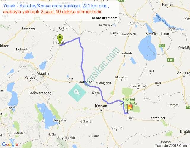 Yunak - Karatay Konya arası yaklaşık olarak 90 km/h ile yukarıda belirtilen sürede olup, iki yerin kuş uçuşu uzaklığı (mesafesi) 154'dir. Yolculuk otobüsle 3 saat 28 dakika sürmektedir.
