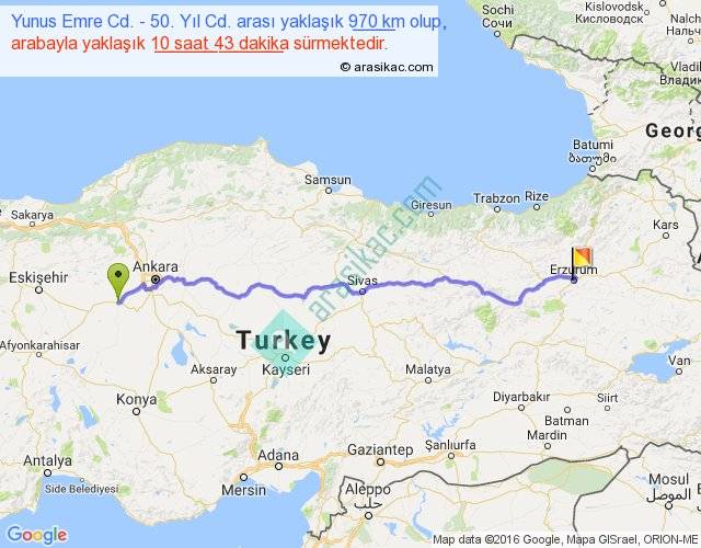 Yunus Emre Cd. - 50. Yıl Cd. arası yaklaşık olarak 90 km/h ile yukarıda belirtilen sürede olup, iki yerin kuş uçuşu uzaklığı (mesafesi) 779'dir. Eğer belirtilen yerler arasında uçak seferi var ise bu süre uçakla 1 saat 11 dakika'ya kadar düşebilir. Yolculuk otobüsle 13 saat 55 dakika sürmektedir.
