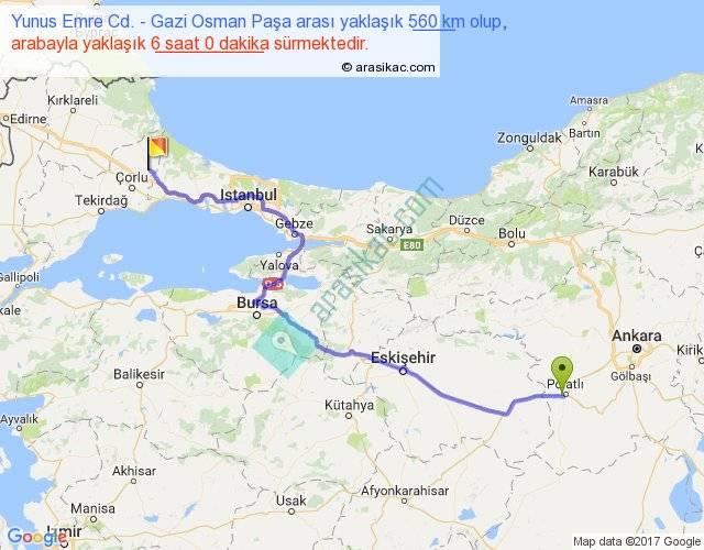 Yunus Emre Cd. - Gazi Osman Paşa arası yaklaşık olarak 90 km/h ile yukarıda belirtilen sürede olup, iki yerin kuş uçuşu uzaklığı (mesafesi) 395'dir. Eğer belirtilen yerler arasında uçak seferi var ise bu süre uçakla 36 dakika'ya kadar düşebilir. Yolculuk otobüsle 7 saat 48 dakika sürmektedir.