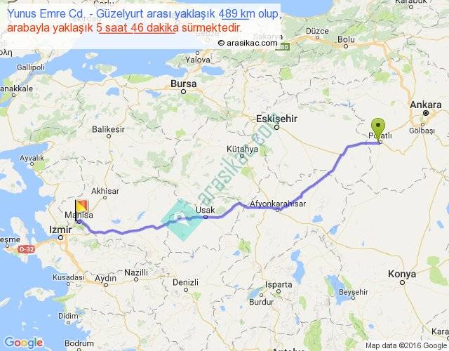 Yunus Emre Cd. - Güzelyurt arası yaklaşık olarak 90 km/h ile yukarıda belirtilen sürede olup, iki yerin kuş uçuşu uzaklığı (mesafesi) 419'dir. Eğer belirtilen yerler arasında uçak seferi var ise bu süre uçakla 38 dakika'ya kadar düşebilir. Yolculuk otobüsle 7 saat 29 dakika sürmektedir.