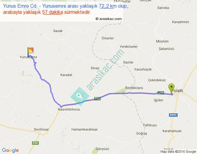 Yunus Emre Cd. - Yunusemre arası yaklaşık olarak 90 km/h ile yukarıda belirtilen sürede olup, iki yerin kuş uçuşu uzaklığı (mesafesi) 56'dir. Yolculuk otobüsle 1 saat 14 dakika sürmektedir.
