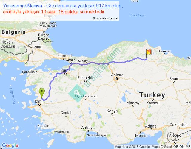Yunusemre Manisa - Gökdere arası yaklaşık olarak 90 km/h ile yukarıda belirtilen sürede olup, iki yerin kuş uçuşu uzaklığı (mesafesi) 701'dir. Eğer belirtilen yerler arasında uçak seferi var ise bu süre uçakla 1 saat 04 dakika'ya kadar düşebilir. Yolculuk otobüsle 13 saat 23 dakika sürmektedir.