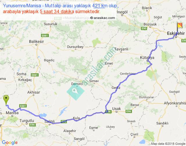 Yunusemre Manisa - Muttalip arası yaklaşık olarak 90 km/h ile yukarıda belirtilen sürede olup, iki yerin kuş uçuşu uzaklığı (mesafesi) 301'dir. Eğer belirtilen yerler arasında uçak seferi var ise bu süre uçakla 27 dakika'ya kadar düşebilir. Yolculuk otobüsle 7 saat 14 dakika sürmektedir.