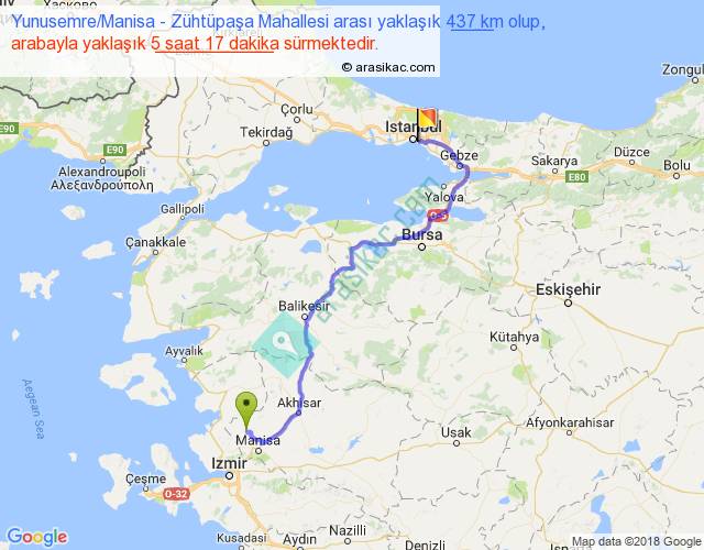 Yunusemre Manisa - Zühtüpaşa Mahallesi arası yaklaşık olarak 90 km/h ile yukarıda belirtilen sürede olup, iki yerin kuş uçuşu uzaklığı (mesafesi) 286'dir. Eğer belirtilen yerler arasında uçak seferi var ise bu süre uçakla 26 dakika'ya kadar düşebilir. Yolculuk otobüsle 6 saat 52 dakika sürmektedir.