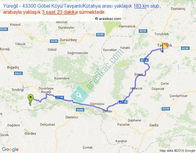 Yüreğil - 43300 Göbel Köyü Tavşanlı Kütahya arası yaklaşık olarak 90 km/h ile yukarıda belirtilen sürede olup, iki yerin kuş uçuşu uzaklığı (mesafesi) 109'dir. Yolculuk otobüsle 4 saat 23 dakika sürmektedir.