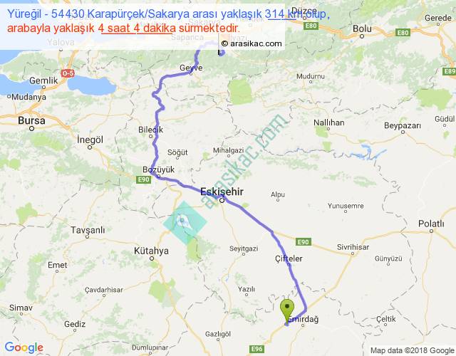 Yüreğil - 54430 Karapürçek Sakarya arası yaklaşık olarak 90 km/h ile yukarıda belirtilen sürede olup, iki yerin kuş uçuşu uzaklığı (mesafesi) 182'dir. Yolculuk otobüsle 5 saat 17 dakika sürmektedir.