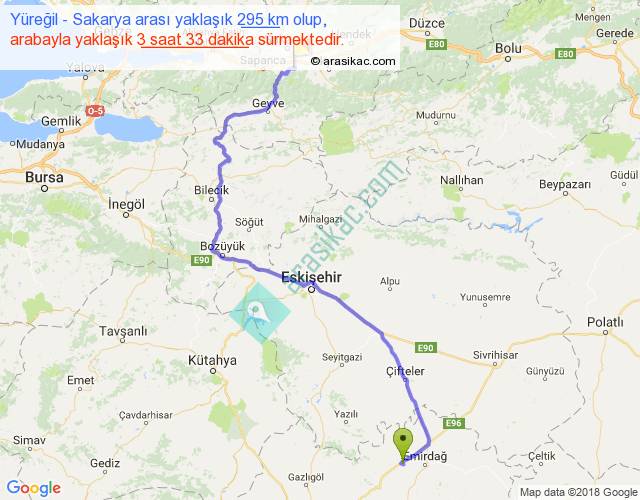 Yüreğil - Sakarya arası yaklaşık olarak 90 km/h ile yukarıda belirtilen sürede olup, iki yerin kuş uçuşu uzaklığı (mesafesi) 191'dir. Yolculuk otobüsle 4 saat 36 dakika sürmektedir.