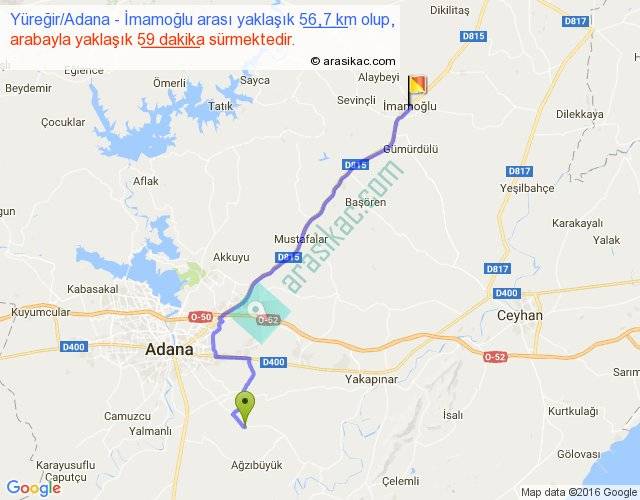 Yüreğir Adana - İmamoğlu arası yaklaşık olarak 90 km/h ile yukarıda belirtilen sürede olup, iki yerin kuş uçuşu uzaklığı (mesafesi) 44'dir. Yolculuk otobüsle 1 saat 16 dakika sürmektedir.
