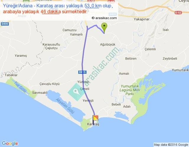 Yüreğir Adana - Karataş arası yaklaşık olarak 90 km/h ile yukarıda belirtilen sürede olup, iki yerin kuş uçuşu uzaklığı (mesafesi) 38'dir. Yolculuk otobüsle 59 dakika sürmektedir.