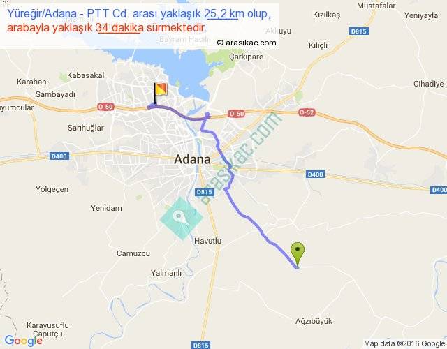Yüreğir Adana - PTT Cd. arası yaklaşık olarak 90 km/h ile yukarıda belirtilen sürede olup, iki yerin kuş uçuşu uzaklığı (mesafesi) 19'dir. Yolculuk otobüsle 44 dakika sürmektedir.