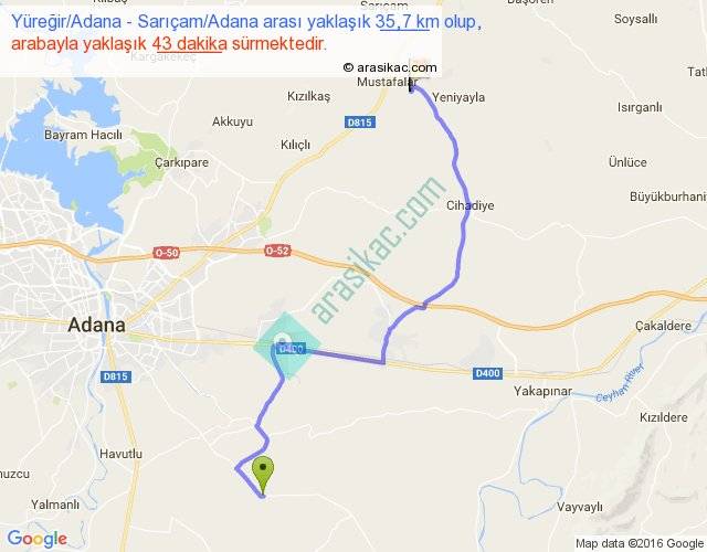 Yüreğir Adana - Sarıçam Adana arası yaklaşık olarak 90 km/h ile yukarıda belirtilen sürede olup, iki yerin kuş uçuşu uzaklığı (mesafesi) 24'dir. Yolculuk otobüsle 55 dakika sürmektedir.