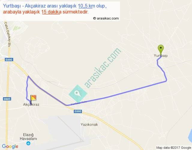 Yurtbaşı - Akçakiraz arası yaklaşık olarak 90 km/h ile yukarıda belirtilen sürede olup, iki yerin kuş uçuşu uzaklığı (mesafesi) 7'dir. Yolculuk otobüsle 19 dakika sürmektedir.