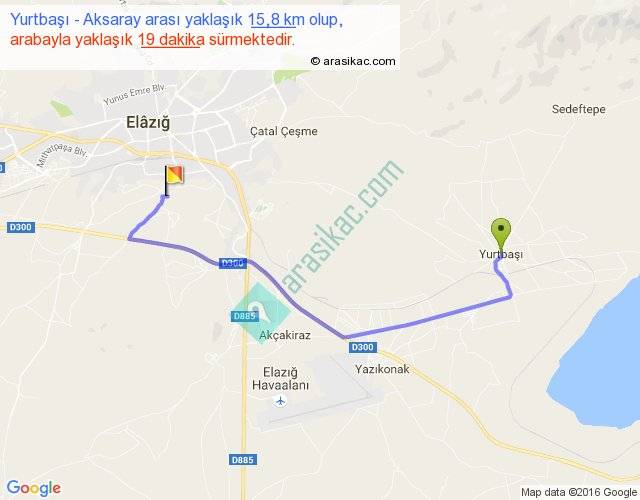 Yurtbaşı - Aksaray arası yaklaşık olarak 90 km/h ile yukarıda belirtilen sürede olup, iki yerin kuş uçuşu uzaklığı (mesafesi) 10'dir. Yolculuk otobüsle 24 dakika sürmektedir.