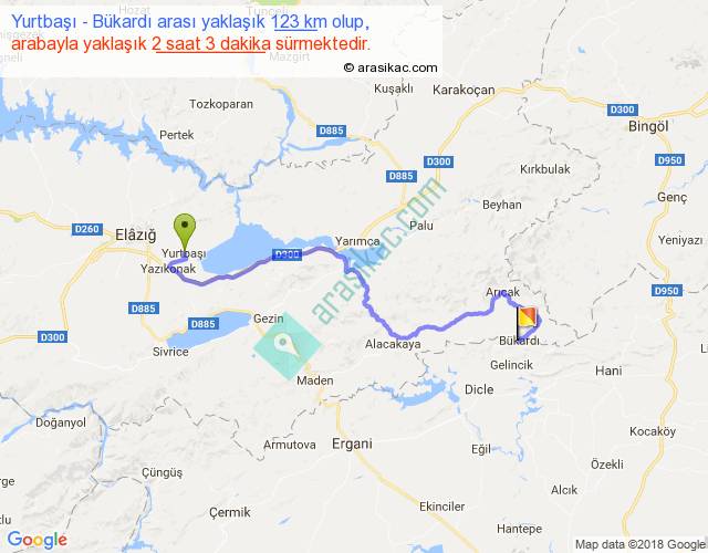 Yurtbaşı - Bükardı arası yaklaşık olarak 90 km/h ile yukarıda belirtilen sürede olup, iki yerin kuş uçuşu uzaklığı (mesafesi) 74'dir. Yolculuk otobüsle 2 saat 39 dakika sürmektedir.