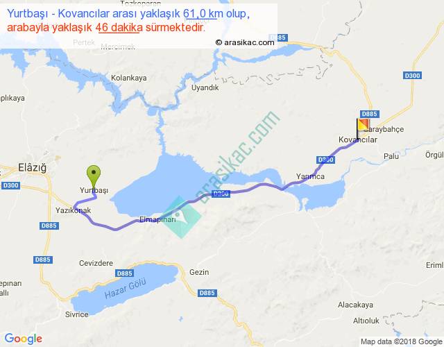Yurtbaşı - Kovancılar arası yaklaşık olarak 90 km/h ile yukarıda belirtilen sürede olup, iki yerin kuş uçuşu uzaklığı (mesafesi) 46'dir. Yolculuk otobüsle 59 dakika sürmektedir.