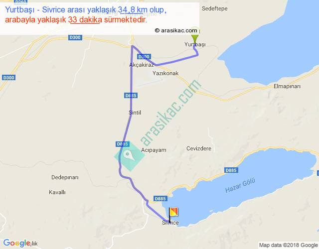 Yurtbaşı - Sivrice arası yaklaşık olarak 90 km/h ile yukarıda belirtilen sürede olup, iki yerin kuş uçuşu uzaklığı (mesafesi) 21'dir. Yolculuk otobüsle 42 dakika sürmektedir.