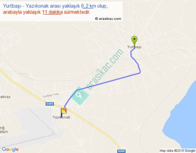Yurtbaşı - Yazıkonak arası yaklaşık olarak 90 km/h ile yukarıda belirtilen sürede olup, iki yerin kuş uçuşu uzaklığı (mesafesi) 5'dir. Yolculuk otobüsle 14 dakika sürmektedir.