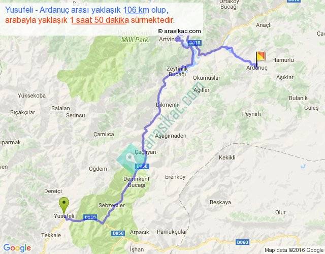 Yusufeli - Ardanuç arası yaklaşık olarak 90 km/h ile yukarıda belirtilen sürede olup, iki yerin kuş uçuşu uzaklığı (mesafesi) 55'dir. Yolculuk otobüsle 2 saat 23 dakika sürmektedir.