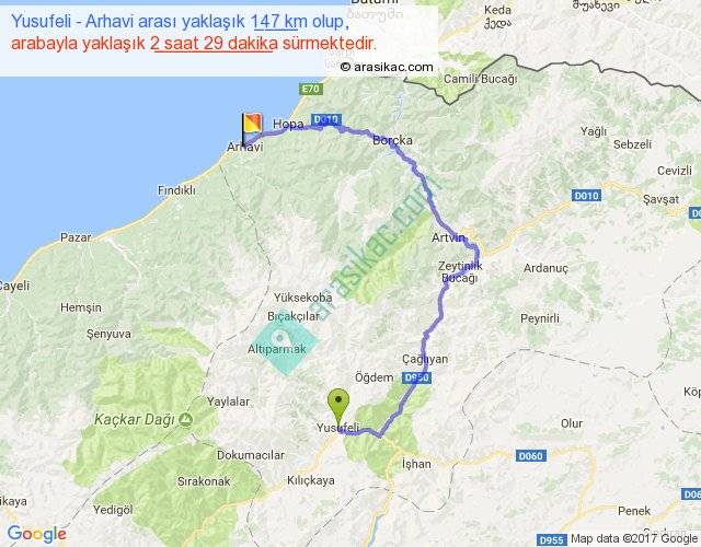 Yusufeli - Arhavi arası yaklaşık olarak 90 km/h ile yukarıda belirtilen sürede olup, iki yerin kuş uçuşu uzaklığı (mesafesi) 62'dir. Yolculuk otobüsle 3 saat 9 dakika sürmektedir.