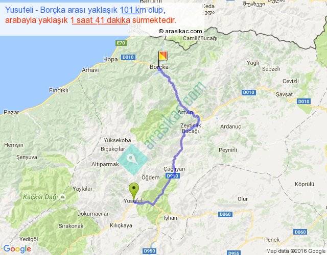 Yusufeli - Borçka arası yaklaşık olarak 90 km/h ile yukarıda belirtilen sürede olup, iki yerin kuş uçuşu uzaklığı (mesafesi) 61'dir. Yolculuk otobüsle 2 saat 11 dakika sürmektedir.