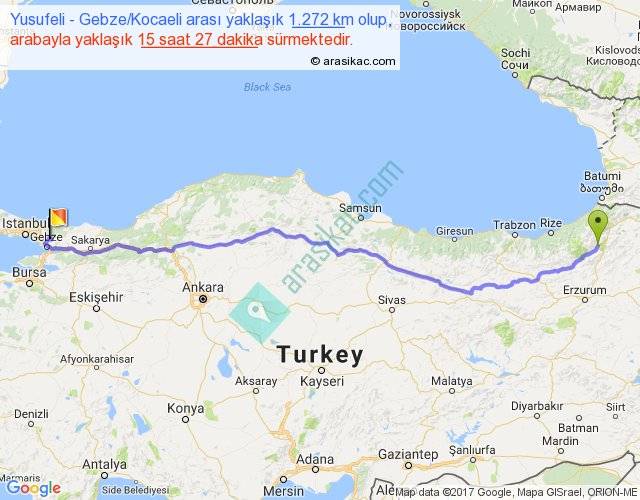Yusufeli - Gebze Kocaeli arası yaklaşık olarak 90 km/h ile yukarıda belirtilen sürede olup, iki yerin kuş uçuşu uzaklığı (mesafesi) 1003'dir. Eğer belirtilen yerler arasında uçak seferi var ise bu süre uçakla 1 saat 32 dakika'ya kadar düşebilir. Yolculuk otobüsle 20 saat 5 dakika sürmektedir.