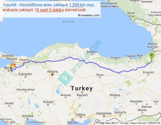 Yusufeli - Kestel Bursa arası yaklaşık olarak 90 km/h ile yukarıda belirtilen sürede olup, iki yerin kuş uçuşu uzaklığı (mesafesi) 1033'dir. Eğer belirtilen yerler arasında uçak seferi var ise bu süre uçakla 1 saat 35 dakika'ya kadar düşebilir. Yolculuk otobüsle 20 saat 59 dakika sürmektedir.
